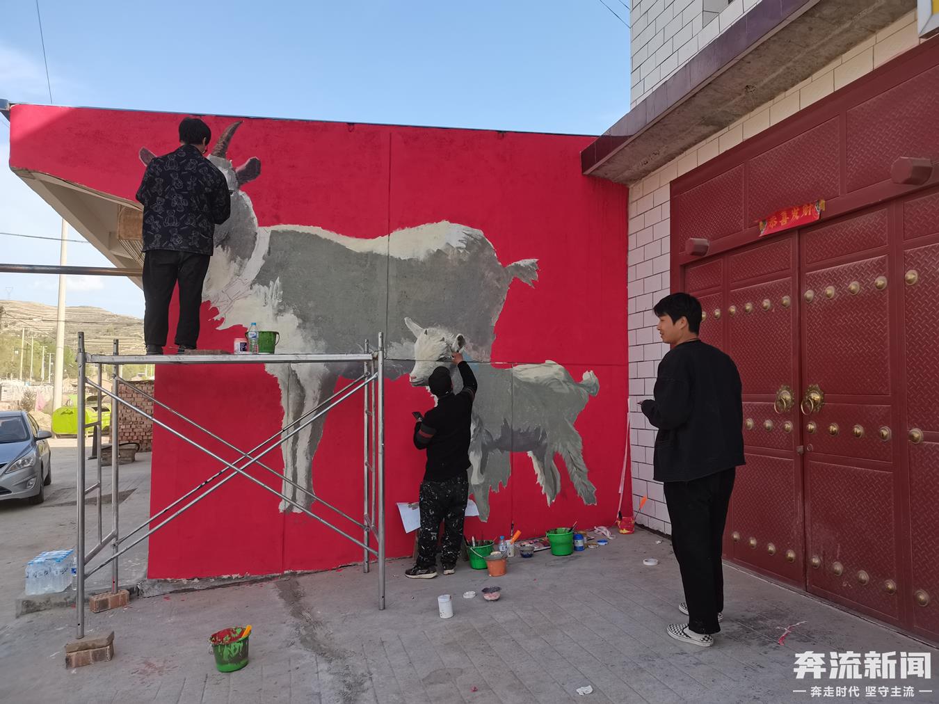 普通的大門上,畫上了孩子們嬉戲的場景;不起眼的墻壁上,畫上了村民養的家畜……一度失去繁華的老街,一下子復活了。“這次來了7個年輕藝術家,看著年齡不大,但都是有十多年創作經驗的,每一幅畫與每一幅畫的關系,畫面與村民和墻面之間的關系,都是經過思考后的創作。”信王軍說,來村里7天,遇到了一場大雪,兩場大雨,從“夏天”經歷到了“冬天”,但從沒停下創作。