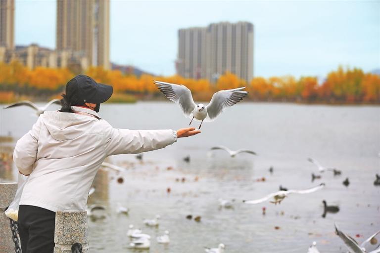 初冬時節,定西市民與候鳥互動。新甘肅·甘肅日報通訊員 王克賢
