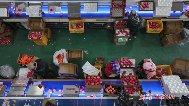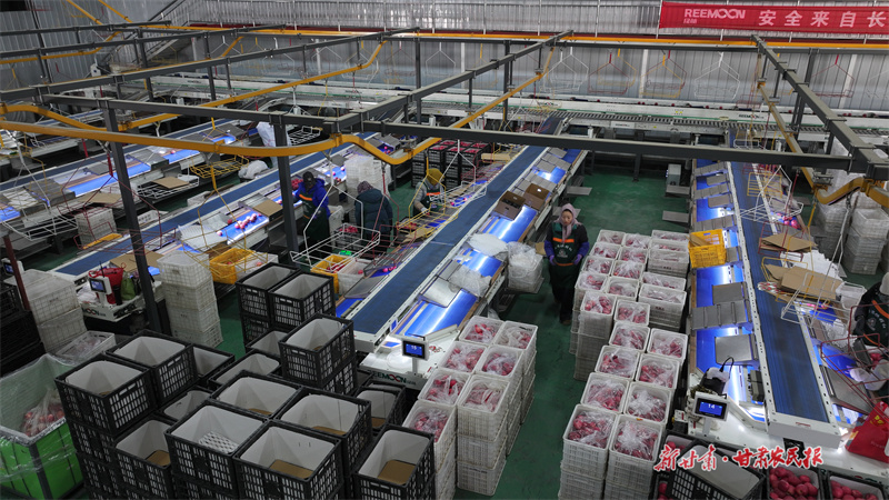 冬日的莊浪梯田大地上,數(shù)十萬(wàn)畝蘋果園在經(jīng)歷春華秋實(shí)的豐收后,正將勞動(dòng)的熱潮延續(xù)至各大貯藏保鮮公司的分揀車間。走進(jìn)莊浪縣茂源果品冷鏈物流產(chǎn)業(yè)園內(nèi),智能化分選線有序運(yùn)轉(zhuǎn),一顆顆紅彤彤的蘋果沿軌道緩緩前行,經(jīng)過(guò)精準(zhǔn)檢測(cè),依據(jù)果品大小、色澤、糖度、硬度等指標(biāo)自動(dòng)分級(jí),隨后分類包裝,發(fā)往全國(guó)各地。