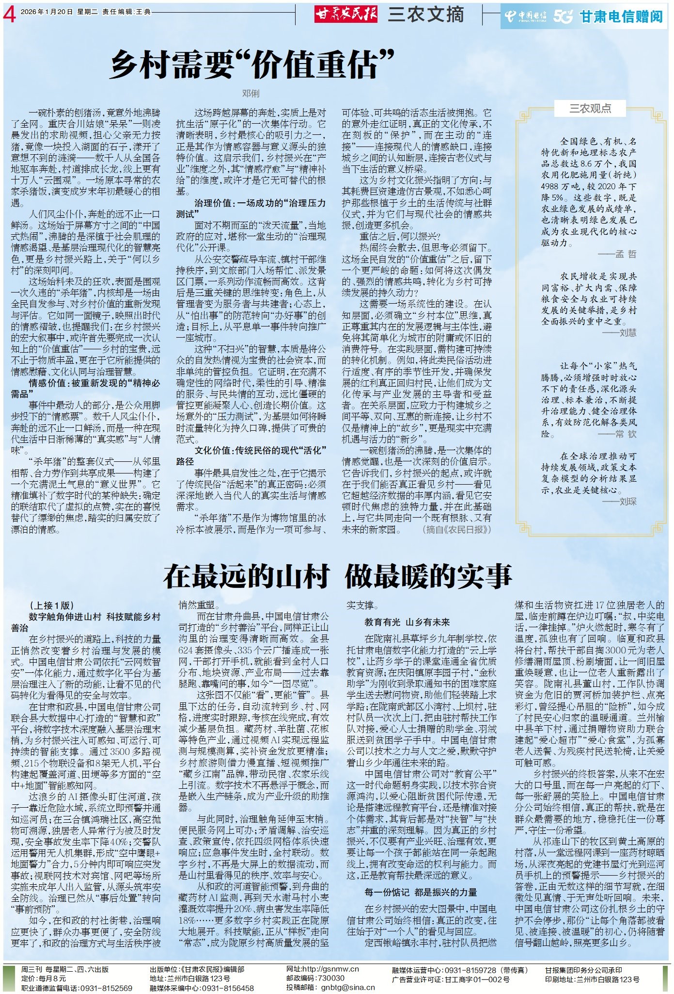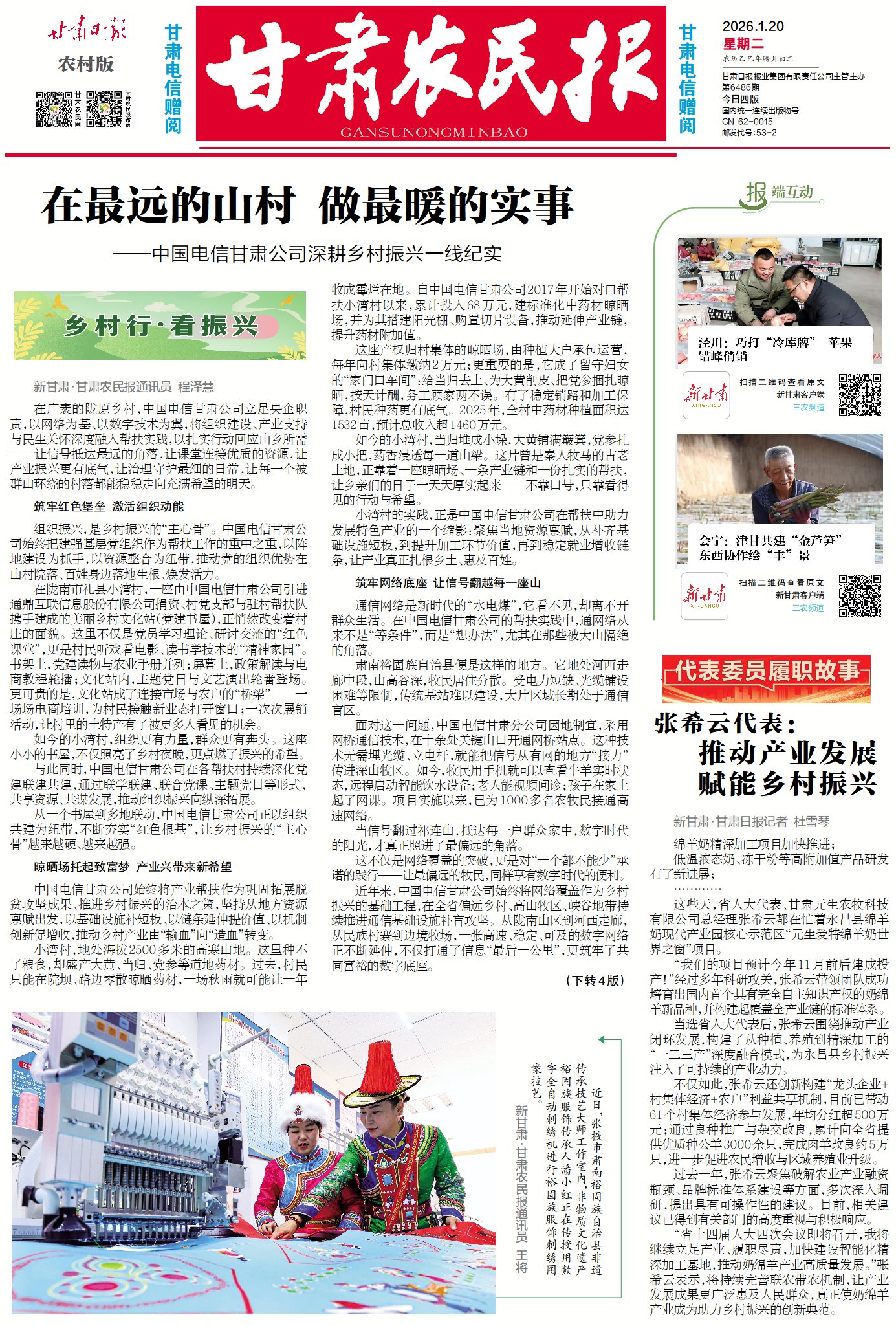 從祁連山下的牧區到黃土高原的村落,從一堂遠程網課到一座藥材晾曬場,從深夜亮起的黨建書屋燈光到巡河員手機上的預警提示——鄉村振興的答卷,正由無數這樣的細節寫就,在細微處見真情、于無聲處聽回響。未來,中國電信甘肅公司這份扎根鄉土的守護不會停步,那份“讓每個角落都被看見、被連接、被溫暖”的初心,仍將隨著信號翻山越嶺,照亮更多山鄉。
