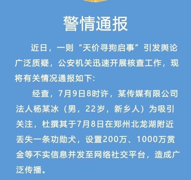 第二宗,“開局一張圖,內容全靠編”,捏造虛假信息。近日,一則“男子懸賞千萬尋狗”消息在網(wǎng)上引發(fā)輿論廣泛質疑,7月11日晚,鄭州警方發(fā)布警情通報,“千萬元尋狗”系徹頭徹尾的假消息,編造該假信息的男子為某傳媒有限公司負責人,該負責人已被處以行拘15日。